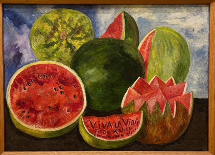 И навсегда останется в памяти прощальная картина Фриды Кало – шары и полумесяцы спелого сахарного арбуза в ярко-зеленой кожуре на фоне синего неба. И надпись на самом сладком пылающем ломте : «Viva La Vida» — «Да здравствует жизнь»!